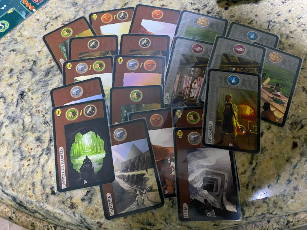 A primeira Era é dedicada à base econômica. As cartas de recursos, identificadas pelas cores marrom e cinza, garantem matéria-prima e produtos manufaturados essenciais para construções futuras. Quem falha em estruturar bem essa fase inicial tende a enfrentar dificuldades nas eras seguintes.