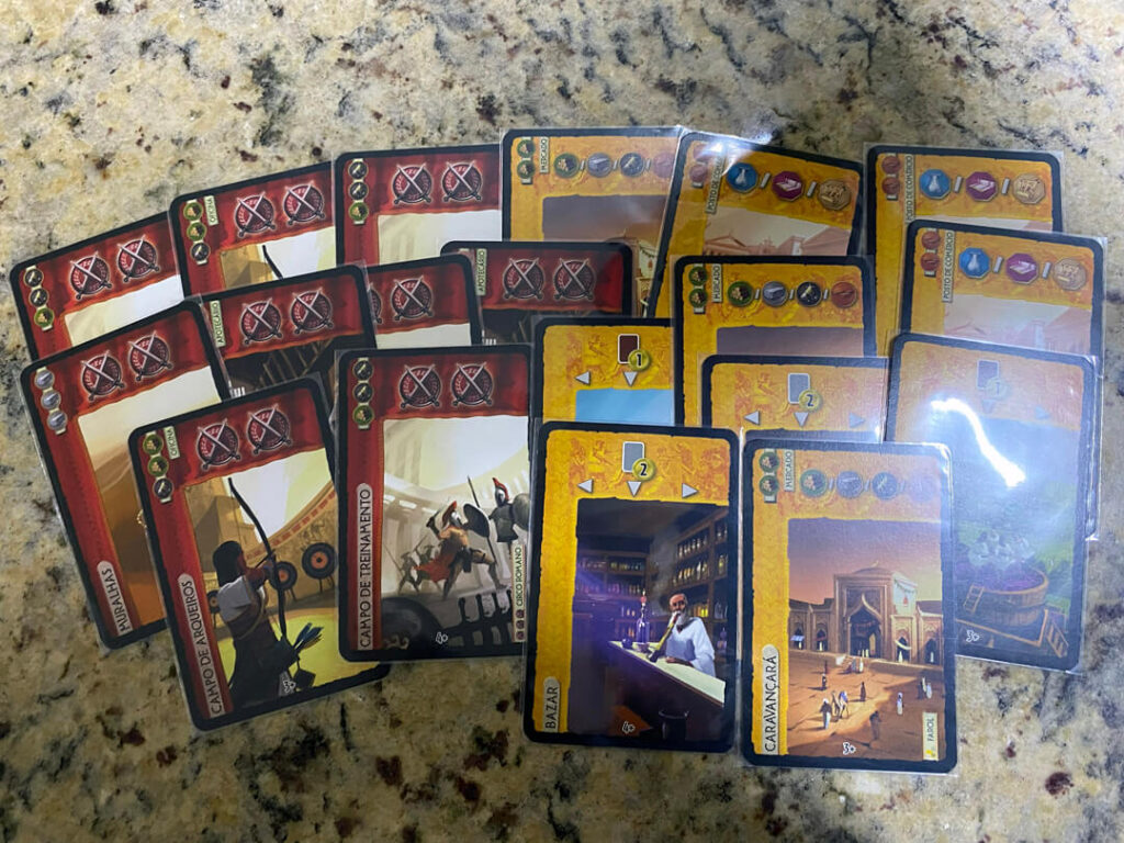 - Construções civis e comerciais, responsáveis por pontos de vitória e vantagens econômicas;